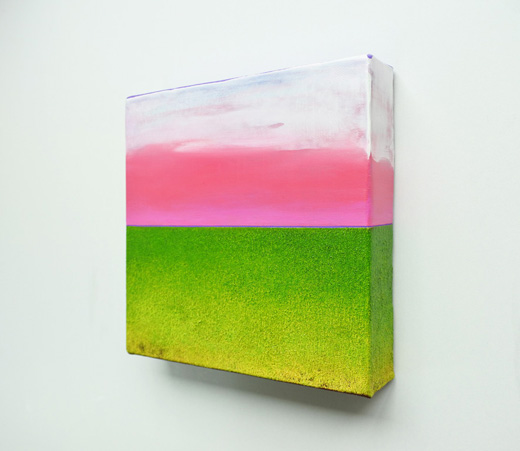 Kumiko Tamura's paintings are done on square canvasses with depths of 7-10 cm, with a picture composition wherein scenes of city or nature are split in two parts by the horizon.