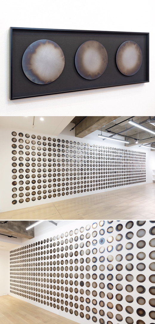 「Observation of daily explosion」 の3枚組セット。 鉄の円盤を毎日焼き、炎の揺らぎを写しとる。その形は一枚として同じ物はなく自然の現象として美しい。しかし、同時に自身の秘めた暴力性が抽象化し、露呈する。 日々の爆発の記録である。