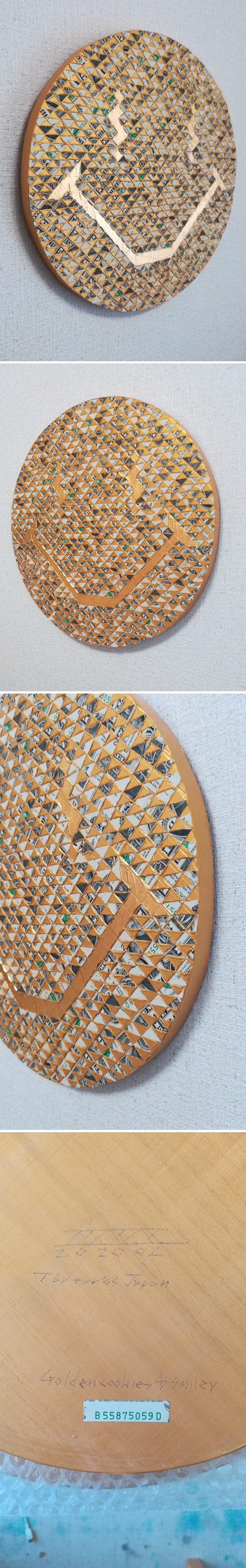 Golden cookies smileyシリーズ 現金が消え、デジタルマネーに切り替わる21世紀。現金が世界から消える前に、黄金クッキーを召し上がれ。 本物の紙幣を刻み、混ぜ、見ないで選びコラージュするAutomaticPaintingシリーズ。smileyシンボルを引用したGolden cookies smiley。目は$マークアレンジ。サインコラージュされた$紙幣ナンバーでオリジナル性を担保するコンセプチャルアート。目と口に金箔を使用。