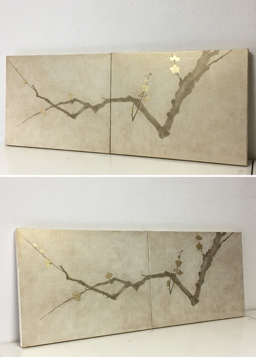 キャンバスに金色の箔と油彩だけで梅の木を描きました。