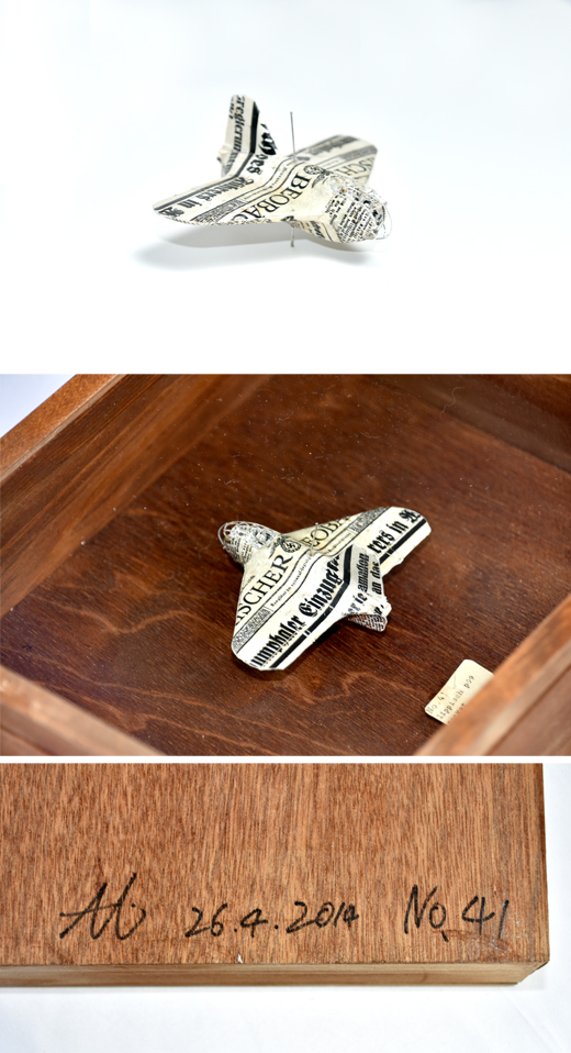 「No.41」:イラストレーションボード・ 新聞(1945年 独逸)・虫ヒ゜ン・ 水彩絵具。炎舞パーツ:新聞・テグス