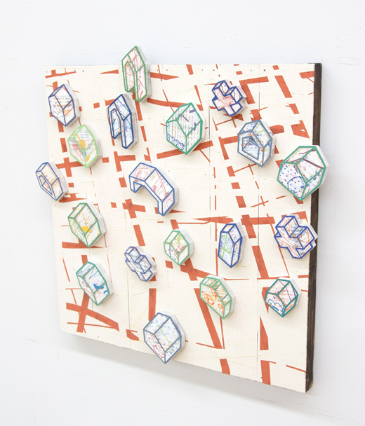 厚紙で作ったブロックやドローイングを描いた布などを組み合わせて構成する。 それらは自分のイメージの設計図でありながら、建物のようになったり、街のようになったり、それにすら至らない抽象的な空間になったりする。 そのモチーフを撮影した後、情報をPC上で抽出し、作品の原型としている。 一度質量のない情報に変換された空間のイメージは、物質として存在する画材の色彩や質感を依代として、再び実在感を獲得していく。