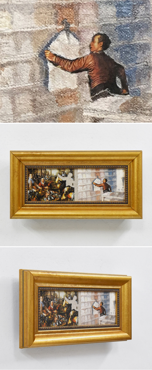 キャンバスに油絵具、コラージュ