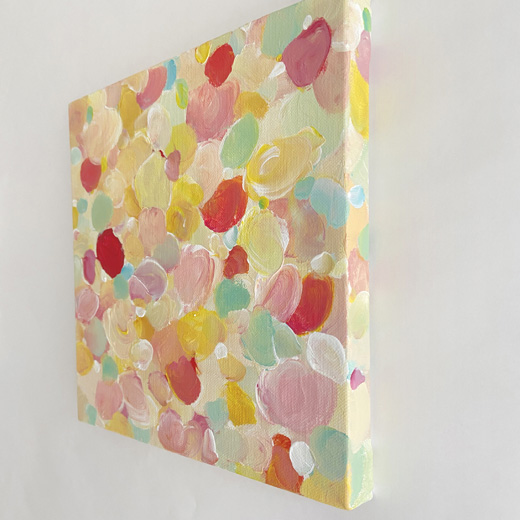 アクリル絵具や油絵具による塗りのつぶれやかすれ、色の重なり合いや模様のようなものたちが作り出すユニークなハーモニーが、彼女の絵の最大の美質です。その時々の彼女自身が置かれた環境や内面世界が手から筆へと転送され、色合いはときにオーソドックスな油画の伝統を思わせるメランコリックな情緒をまとい、特にはストリートアートのようにポップで鮮やかな躍動で見るものの心を震わせます。