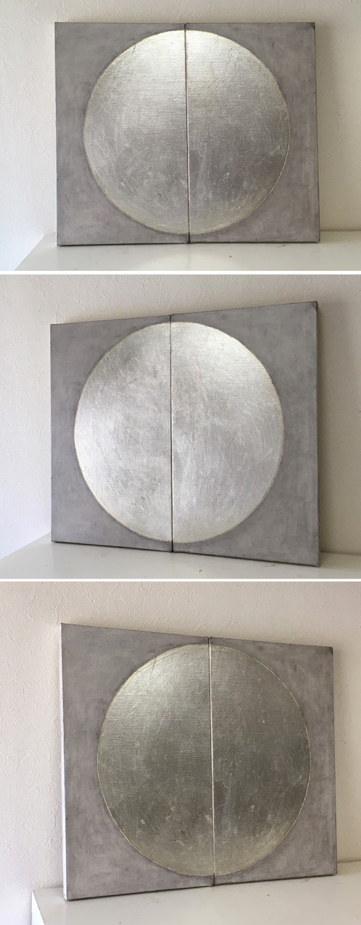 キャンバスに金色の箔と油彩で月の絵を描いて見ました。二枚で一組となっています。二枚はくっついていないので、離して飾ることもできます。