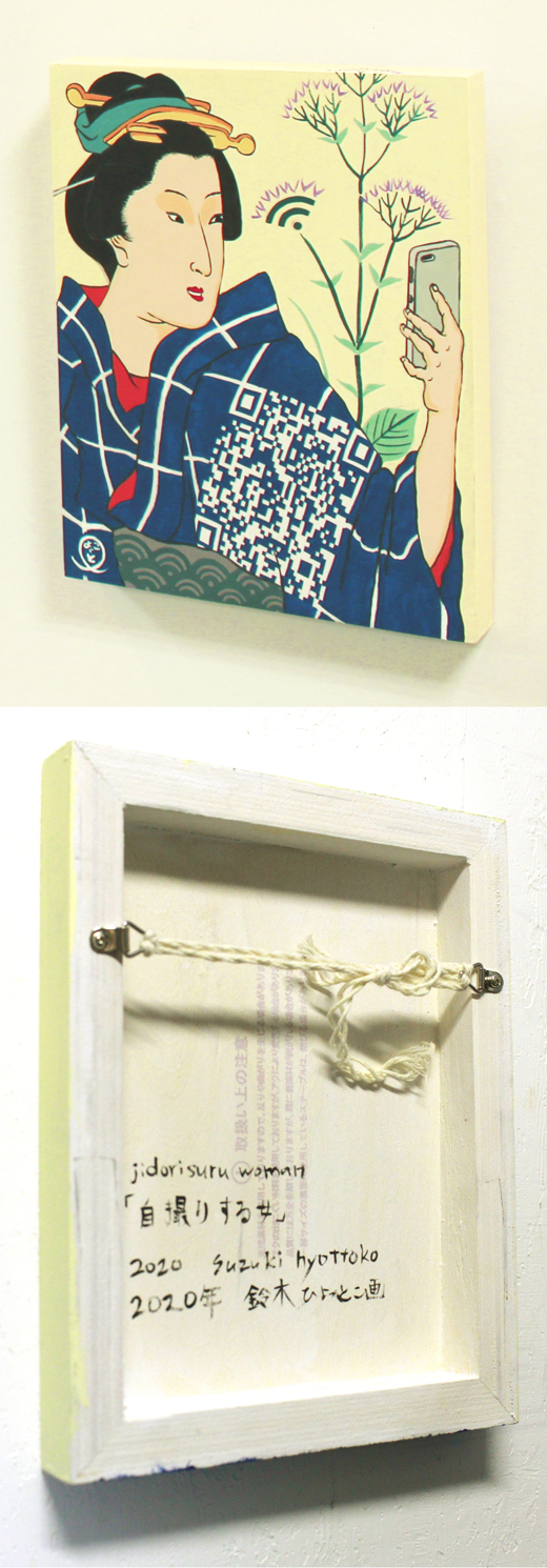歌川広重の浮世絵「四季の花園 桔梗」に登場する女性の着物の紋様をQRに見立て、自撮りしている姿に描いています。