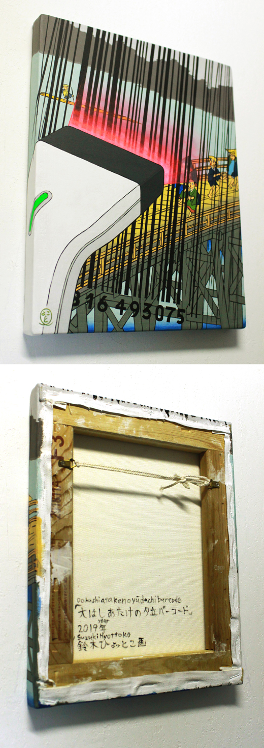 歌川広重の「名所江戸百景 大はしあたけの夕立」の雨の線の表現をバーコードに見立て、それを機械がスキャンしている光に橋の上の人物が驚いている場面を描いています。