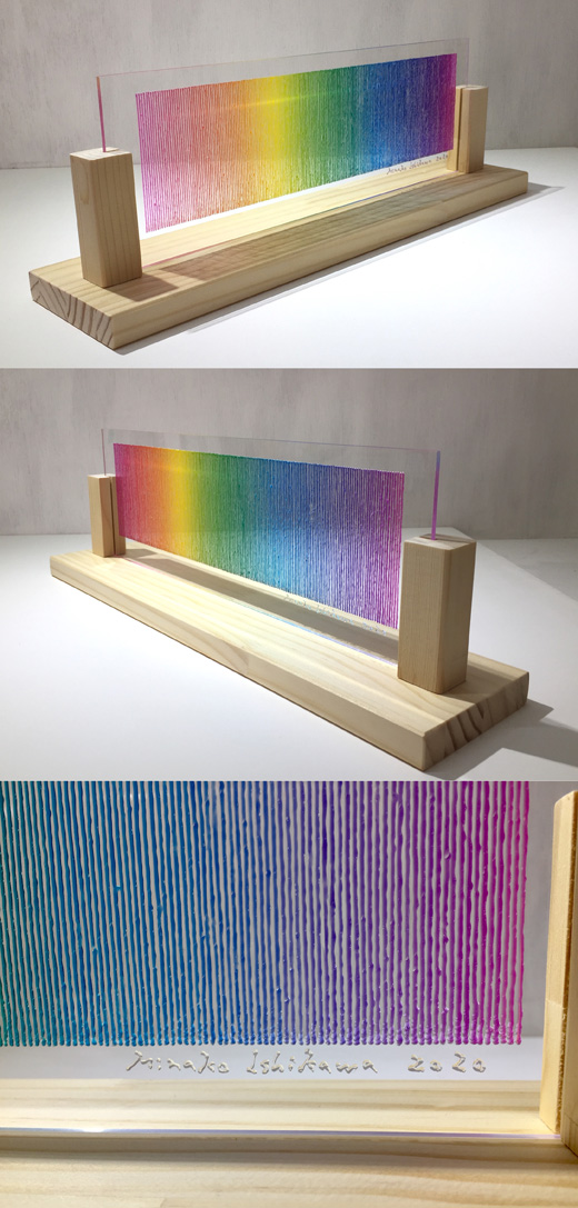 最初、目の前にある空気から光の糸を紡ぎだすという意識で始めたシリーズの作品です。 その意識は時と共に変化し、今は、波長の違いによって色の違いを認識できているということ、自分の目に、脳に、それを認識する機能があるということ、 また、ほんの少しずつ、その変化に気が付かないほどの変化が大きな変化につながり、その並びが、その色が、時に私自身制作をしているときにも心を癒し、励ましてくれるようにも思える色やその変化に不思議さを感じています。 ※アクリル板、上と下の辺は磨き、左右の辺はノコカットの状態です。