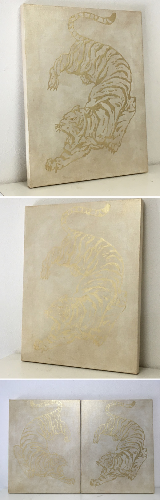 キャンバスに油彩金色の箔で虎の絵を描きました。tiger1と並べて飾ることが出来ます。
