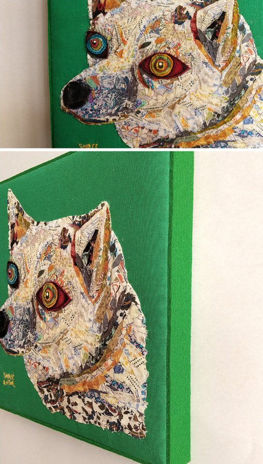 木パネルに布、貼り絵、刺繍