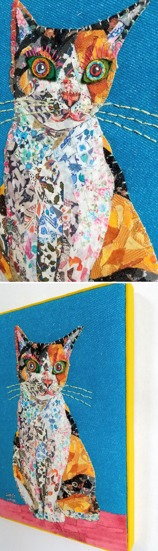 本作は、彼女が大好きな生き物たちを布や刺繍で表現した「布絵」シリーズの新作です。布に貼り絵や刺繍などを細かく施し、木パネルに張り込んだ、見ごたえのある絵肌が楽しいコラージュです。私たち人間と家族としてともに暮らす猫を題材に、その生命の温もりや毛並みの柔らかさなどまで布素材の優しいニュアンスを用いて描いています。
