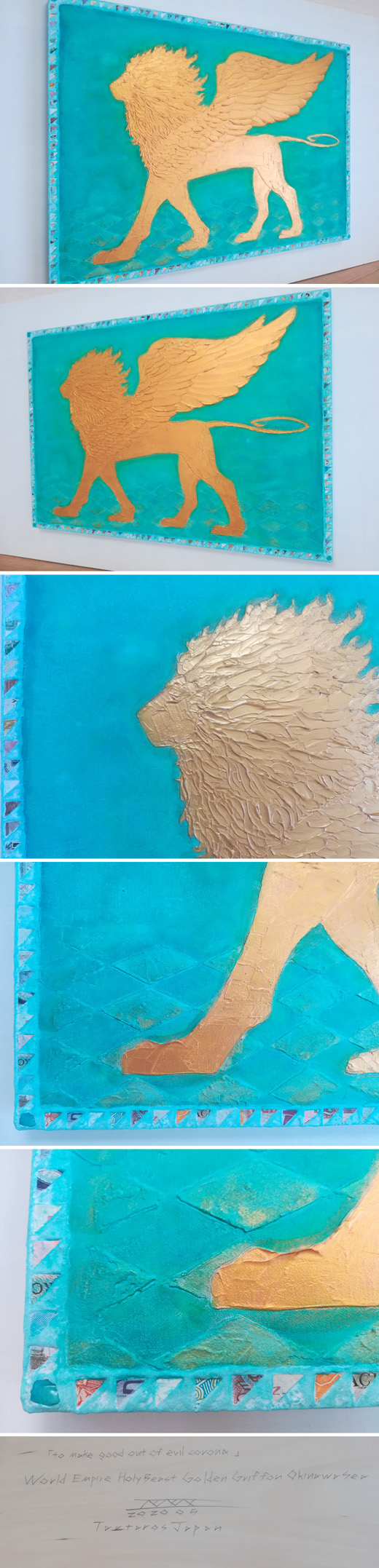瞑想体験で視る聖獣を随分前から描いている。最近は現代美術でも日本独自のモチーフとして幻獣を見る事が多くなった。 日本人は聖獣や幻獣に、親しみや信仰を無くさない特殊な民族だ。近代化された都市空間でも聖獣達は跋扈している。コロナ禍での巷の厄祓いにはピンと来ないが、アフターコロナを象徴する聖獣を描く必要を感じた。 古代文明の神殿にグリフォンは登場する。国家や王よりも大衆の信仰を古くから持つ神々は現代に蘇るだろうか。 「to make good out of evil corona」 2020年はコロナ禍の年として歴史に刻まれ、作品もまた同様な運命にあります。コロナ禍と共に生まれた作品を「コロナ禍を転じて福となす」を冠してリリース。