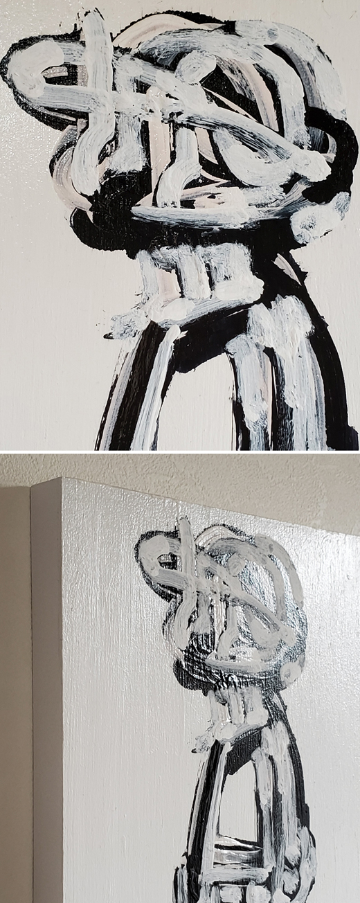 日々意識的無意識的に行っている反復運動とそれに費やした時間を、同じイメージを何度も描き重ねることで「生」を表現している。
