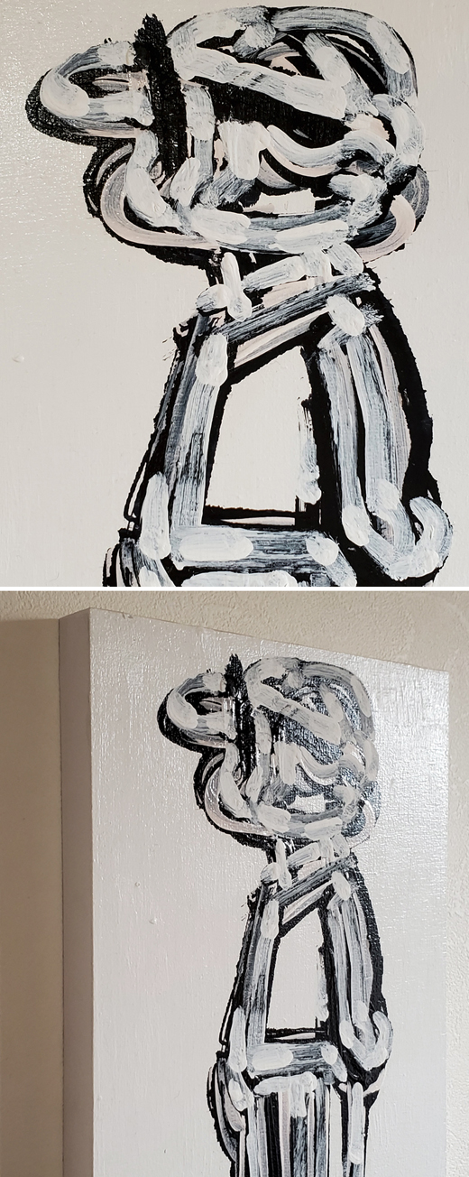 日々意識的無意識的に行っている反復運動とそれに費やした時間を、同じイメージを何度も描き重ねることで「生」を表現している。